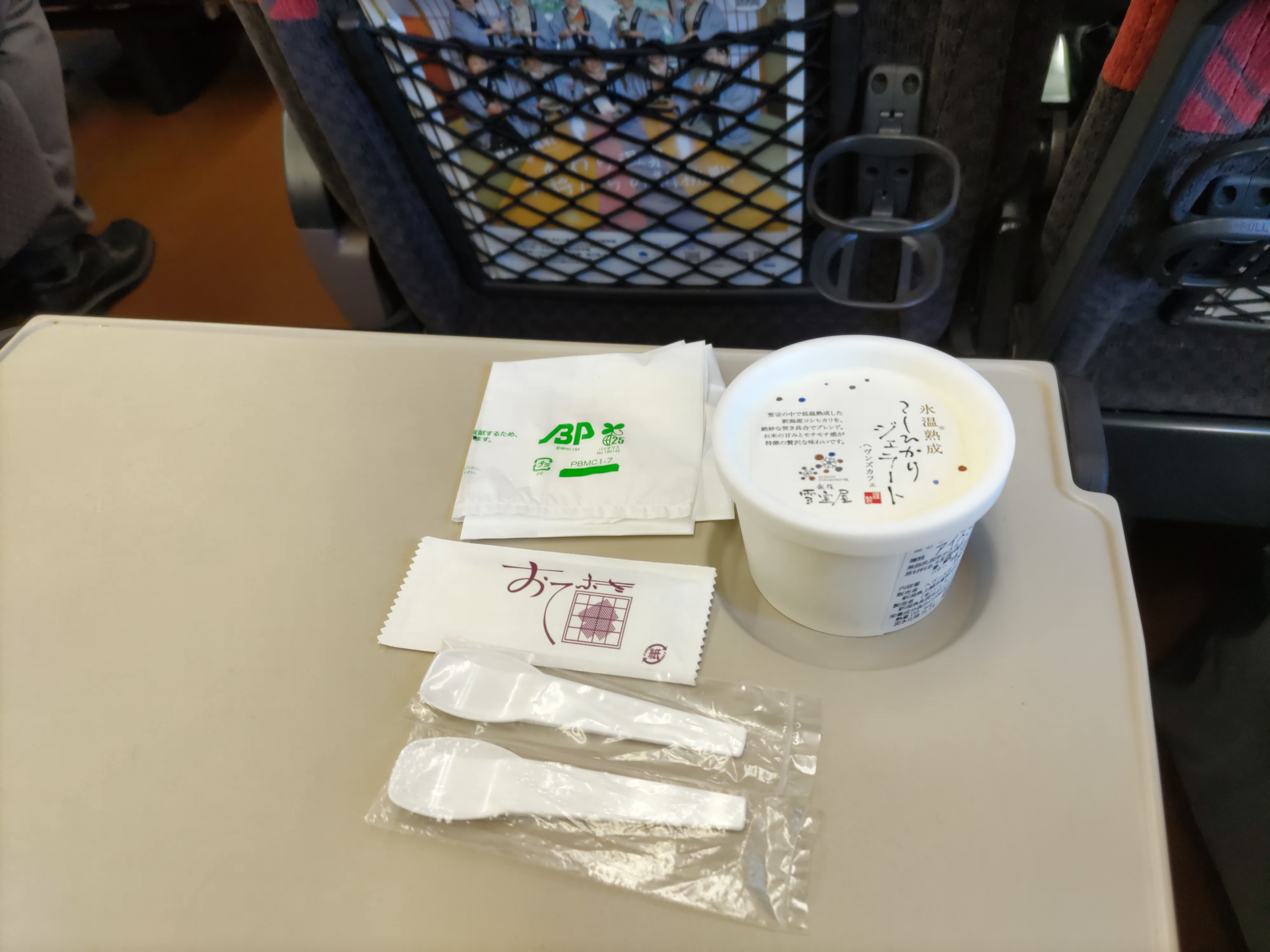 職場のアルバイトの学生さんから勧められていた「こしひかりジェラート」。 車内販売のお姉さんが横に来られた時すぐ目に入ったのですかさず注文。 お姉さんすごく嬉しそうにいろいろ話しかけてくれました スプーンが折れやすいそうで2本つけてくれました。 お米の優しい味で、お米の粒も入っていて癒される味でした。 |