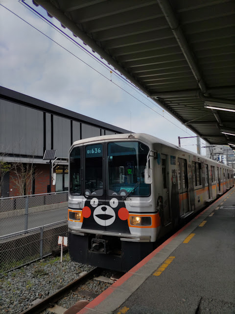 昼食後は鉄オタの息子のため、JRで熊本駅から上熊本駅に移動し、隣接する私鉄の熊本電鉄で一駅分だけ乗車。韓々坂駅のホームは生活道路化しており、住民らしき人たちがホームを通り抜けしていて面白かったです。